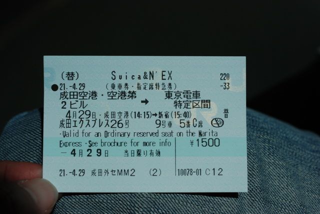 Narita express + Suica 套票(3500yen)內容包括一張從成田機場到東京方向的Narita express指定特急席車票, 和一張2000yen的Suica(其中500yen是保證金,可退, 儲值金額是1500yen)